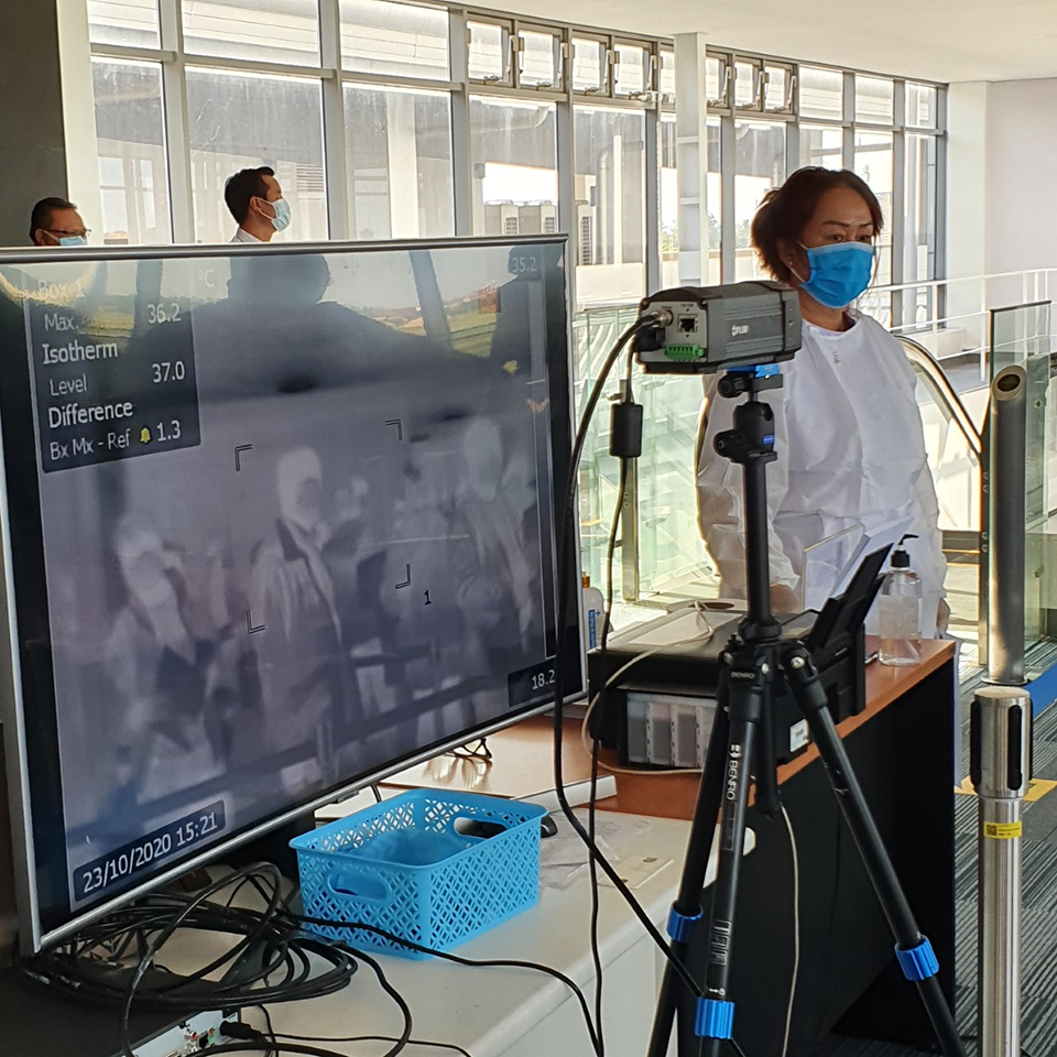 Thermal scanners are installed to monitor the body temperatures of arriving passengers.Photo credit: WHO/Irene Tan