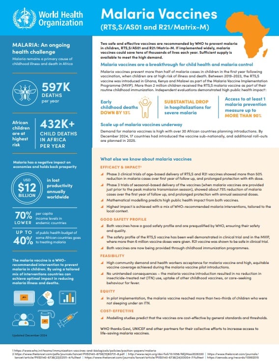 “This global investment is another milestone for the first malaria vaccine, which will boost child survival and extend the reach of malaria prevention through the existing platform of childhood vaccination,” said Dr Kate O’Brien, Director of the Department of Immunization, Vaccines and Biologicals. “This international financing of malaria vaccine doses for country implementation is a concrete step forward to increase access to the RTS,S malaria vaccine.”